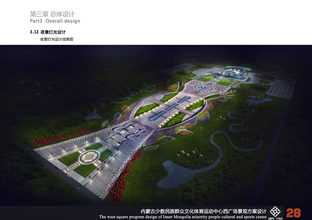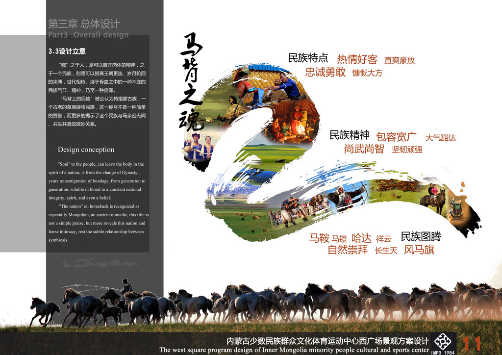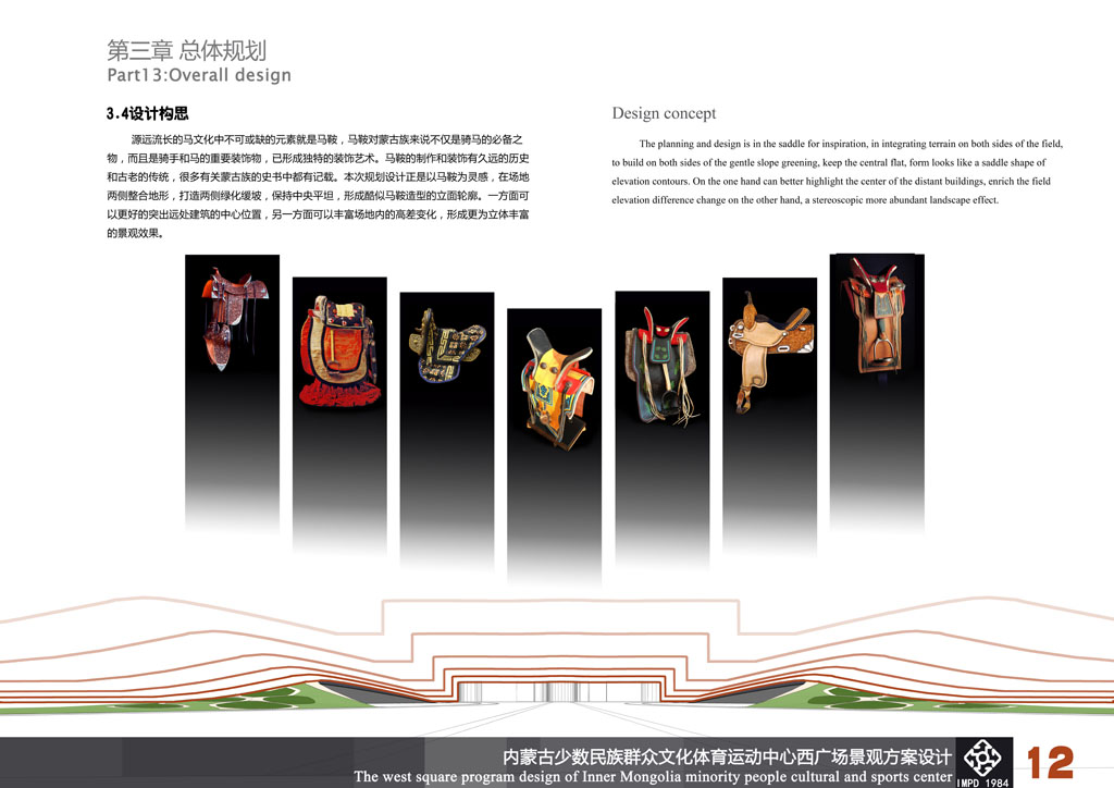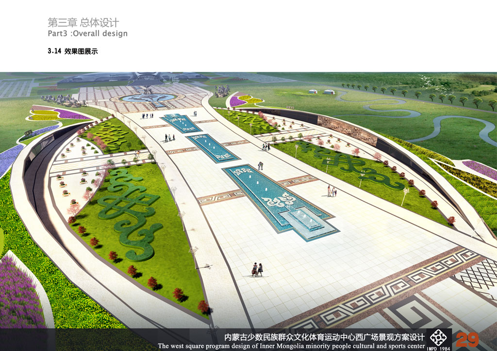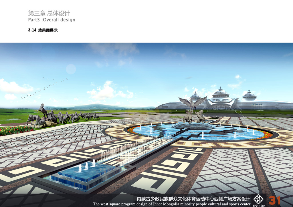 設(shè)計(jì)《馬背之魂》的靈感來源于馬鞍,馬鞍被草原人民譽(yù)為孕育民族搖籃的吉祥物。整個(gè)廣場(chǎng)景觀被設(shè)計(jì)為馬鞍型,場(chǎng)地兩側(cè)和中央入口景觀軸是鞍橋、鞍墊、夾墊、鞍韂和腳蹬,展示出草原“馬背之魂”的氣勢(shì)和氣魄,寓意自治區(qū)及全區(qū)人民吉祥如意。同時(shí),場(chǎng)地入口處設(shè)計(jì)了馬頭琴造型,兩側(cè)是哈達(dá)及迎賓歌舞等雕塑,表達(dá)出草原人民熱情好客的情懷;會(huì)場(chǎng)周邊是“馬圖騰” 和“萬馬奔騰”群雕,進(jìn)一步突出蒙古族豐富多彩的“馬文化”。