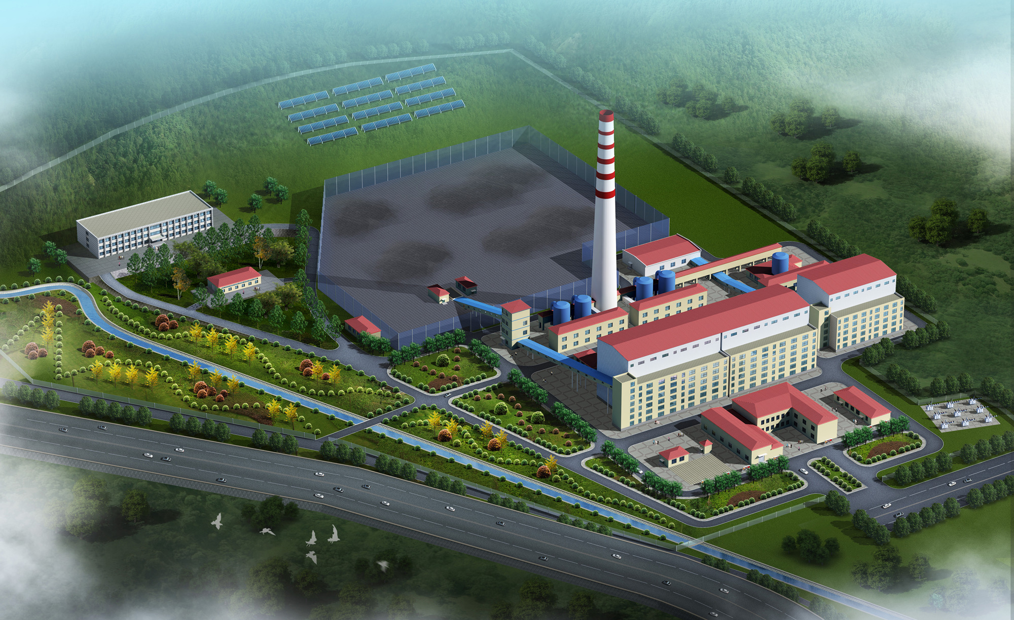 主要工藝系統(tǒng):供煤篩分系統(tǒng)、除灰渣系統(tǒng)、爐內(nèi)脫硫系統(tǒng)、油點火系統(tǒng)、燃燒系統(tǒng)、熱力系統(tǒng)、空壓系統(tǒng)、水處理系統(tǒng)及工業(yè)冷卻水系統(tǒng)