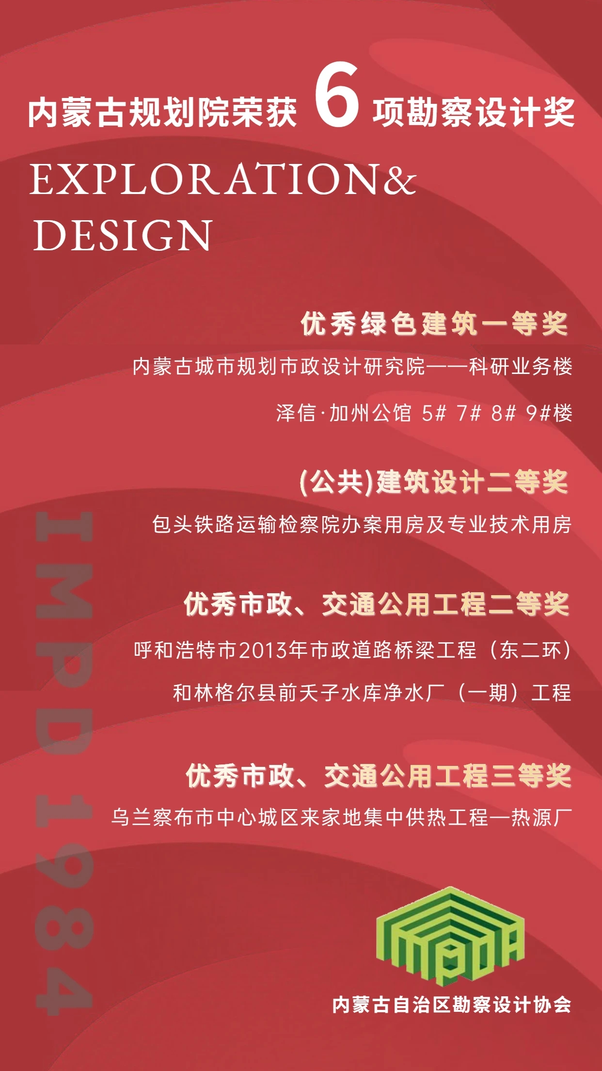 此次我院獲獎作品涵蓋市政工程設(shè)計、建筑工程設(shè)計、工程咨詢、壓力管道設(shè)計、綠色建筑咨詢與研究、建筑節(jié)能等多個專業(yè)領(lǐng)域。申報的每個項目都蘊含著對改善人居環(huán)境的美好愿望,我院也希望通過自身在專業(yè)技術(shù)上的不斷提升、創(chuàng)新和突破,為內(nèi)蒙古地區(qū)勘察設(shè)計行業(yè)質(zhì)量提升和科技成果轉(zhuǎn)化與應(yīng)用起到積極的推動和促進作用。