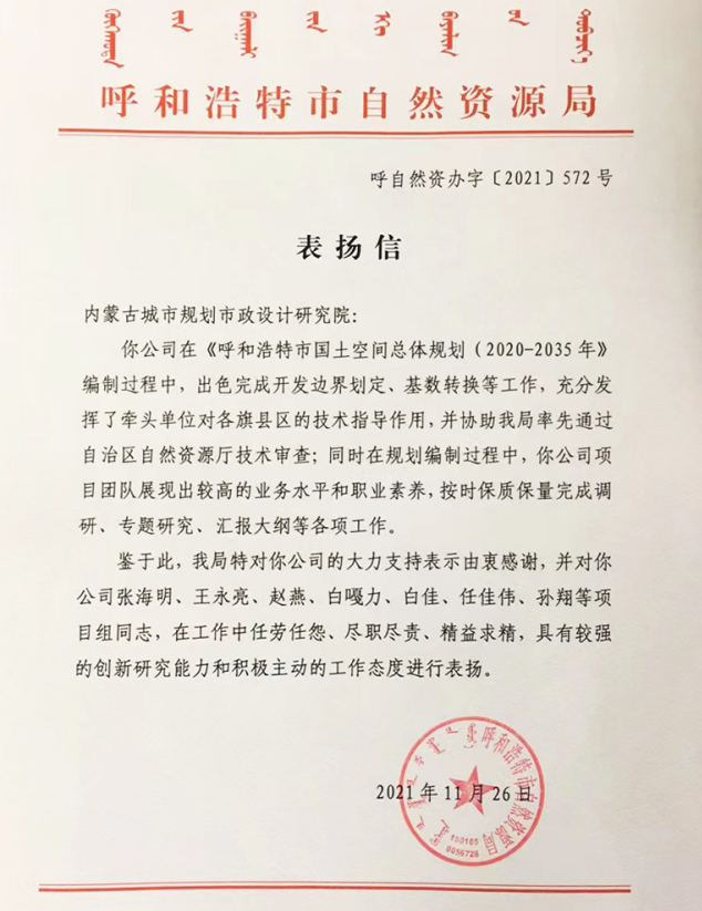近日,呼和浩特市自然資源局向我院發(fā)來(lái)表?yè)P(yáng)信,對(duì)我院參與編制《呼和浩特市國(guó)土空間總體規(guī)劃(2020-2035年)》項(xiàng)目組成員展現(xiàn)出的較高業(yè)務(wù)水平和職業(yè)素養(yǎng)給予充分肯定和表?yè)P(yáng)。