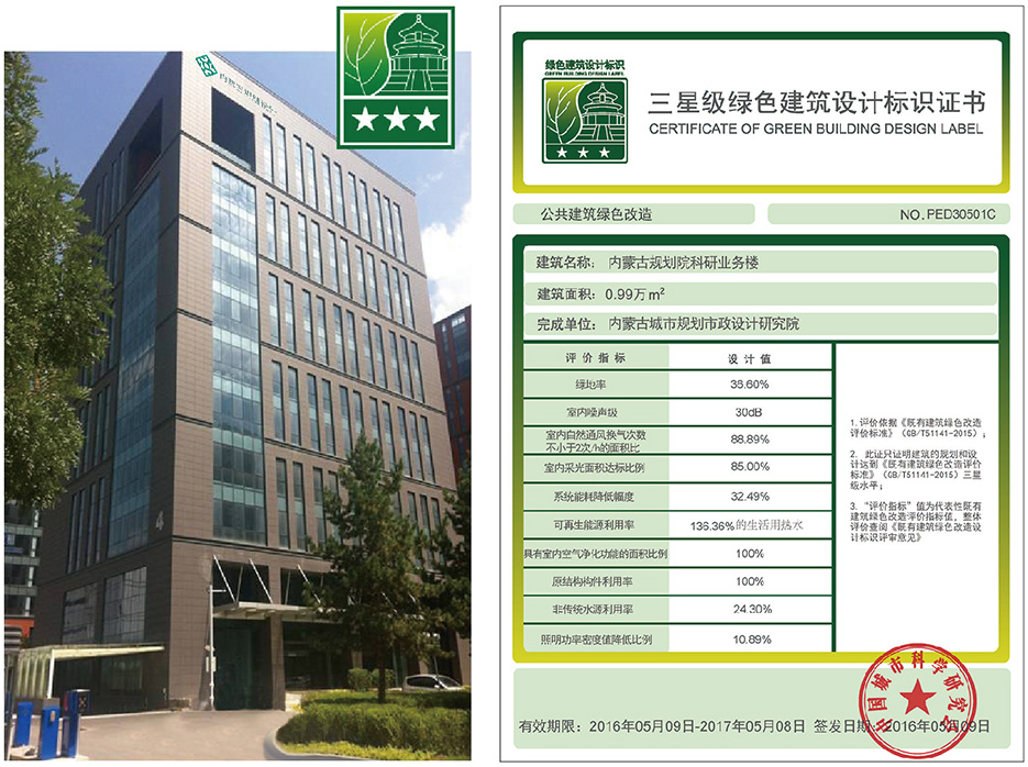 內(nèi)蒙古規(guī)劃院通過對規(guī)劃與建筑、結(jié)構(gòu)與材料暖通空調(diào)、給水排水和電氣等方面進行優(yōu)化設計,使業(yè)務樓改造后達到了既有建筑綠色改造三星級標準。